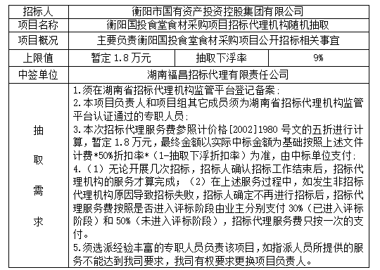 衡陽國投食堂食材采購項目招標代理機構隨機抽取結果公示